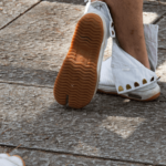 ベンチの横線を、遮るような形で「赤い靴の男の人が何かを思いながら座っている」